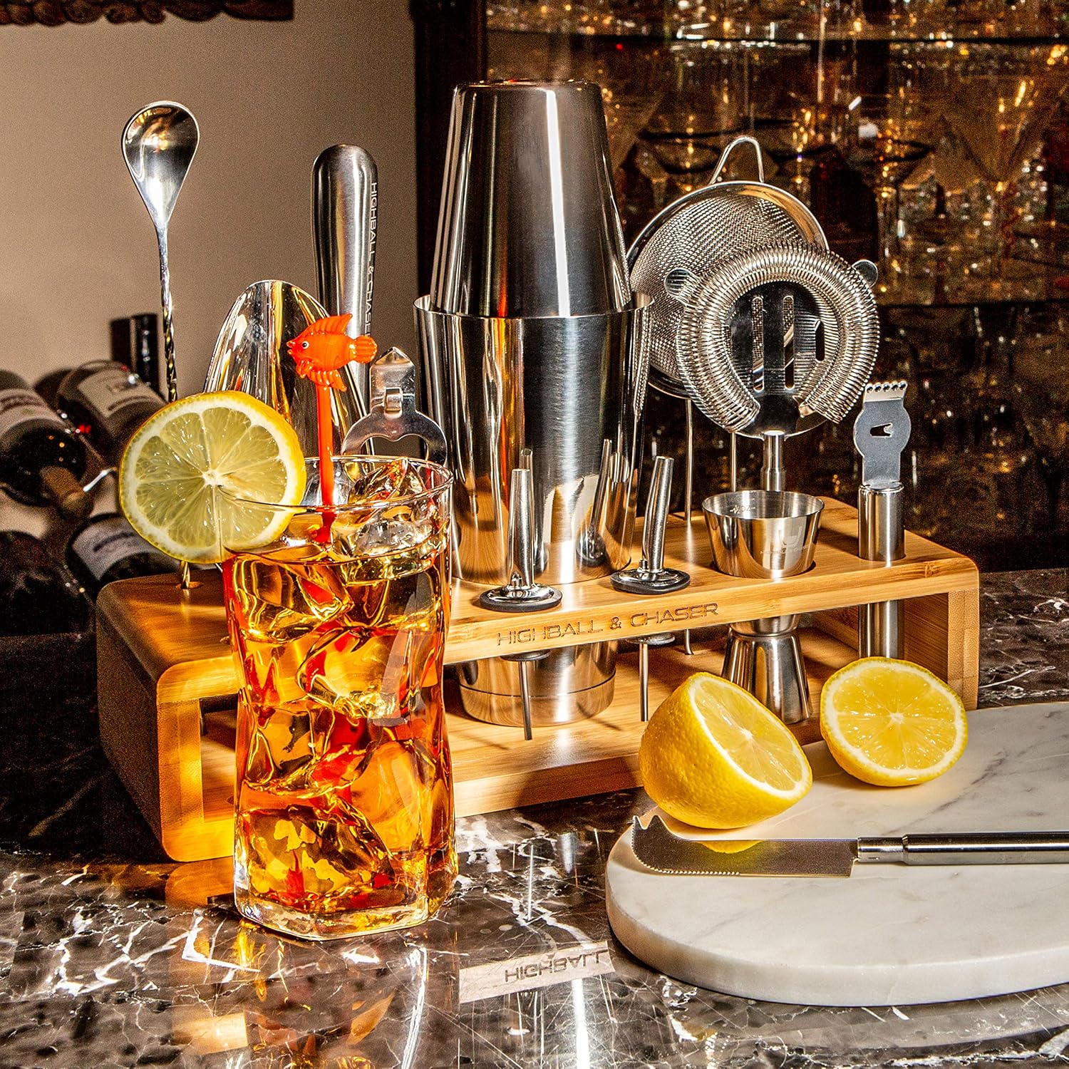 Highball Chaser Cocktail Shaker Bar Set With Natural Bamboo Stand Beautiful Cocktail Shaker Set With Highest Quality Bar Tools Bar Accessories Stainless Steel Boston Shaker Bartender Kit With Stand Tillescenter Bar